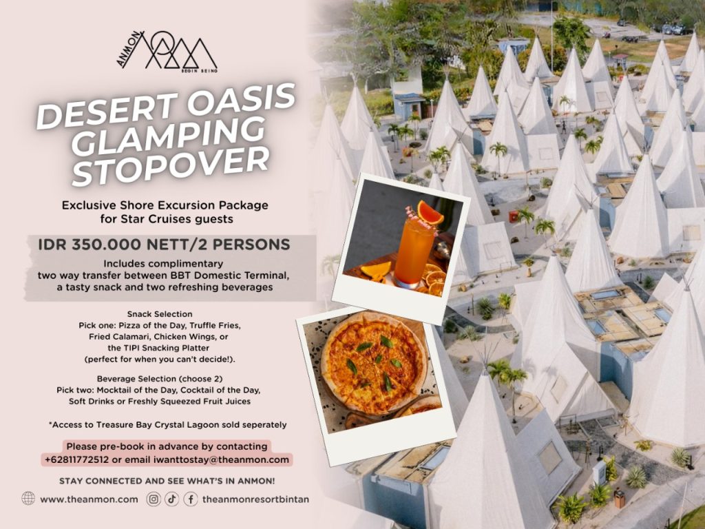 Enjoy a unique Desert Oasis Glamping Stopover at The ANMON Resort Bintan for IDR 350,000 nett per 2 persons, perfect for cruise visitors looking for a stylish and relaxing break.