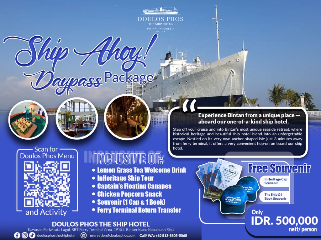 Step off your cruise and into Bintan’s most unique seaside retreat, where historical heritage and beautiful ship hotel blend into an unforgettable escape. Nestled on its very own anchor-shaped isle just 3-minutes away from ferry terminal, it offers a very convenient hop-on on board our ship hotel.